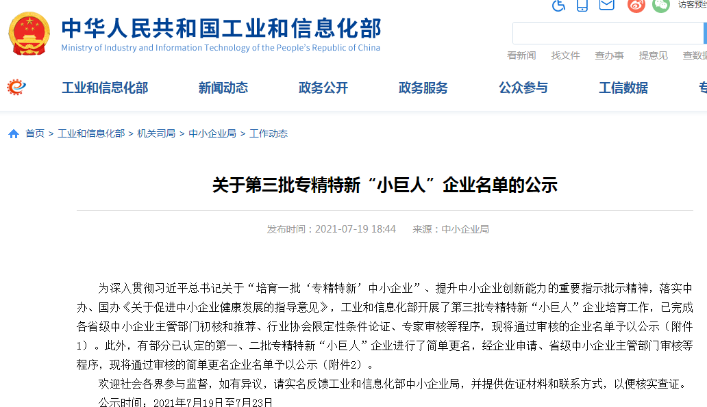 專精特新企業(yè)是指具有“專業(yè)化、精細(xì)化、特色化、新穎化”特征的中小企業(yè),而國家級專精特新“小巨人”是專精特新企業(yè)的最高榮譽稱號,從省級專精特新“小巨人”企業(yè)中篩選,經(jīng)國家工信部審核確認(rèn)后發(fā)布。