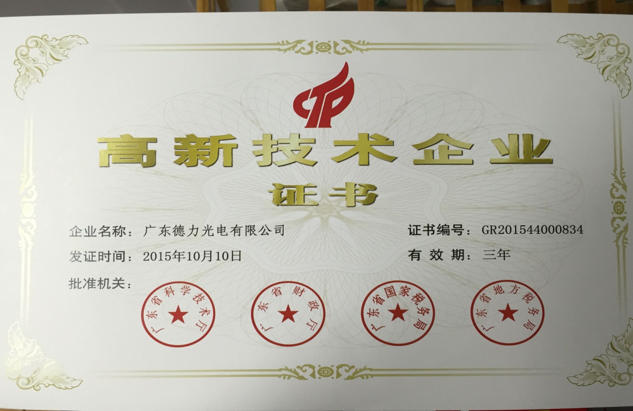 2016年3月25日德力光電收到廣東省科學(xué)技術(shù)廳、廣東省財政廳、廣東省國家稅務(wù)局、廣東省地方稅務(wù)局聯(lián)合頒發(fā)的《高新技術(shù)企業(yè)證書》。這是對德力光電科研成果及技術(shù)創(chuàng)新的認(rèn)可,是企業(yè)科技實力及持續(xù)創(chuàng)新能力的證明。